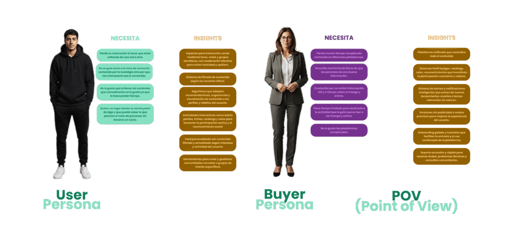La herramienta Point of View (POV) en Ryurooms permitió definir quién es el usuario, qué necesita y por qué lo necesita. Con ella se identificaron frustraciones como la dispersión del contenido y la falta de interacción social, además de motivaciones como pertenecer a una comunidad y acceder a contenido personalizado.