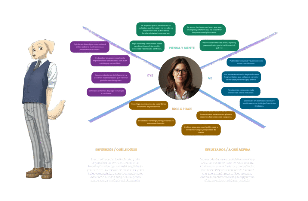 El mapa de empatía es una herramienta visual que ayuda a comprender en profundidad al usuario, más allá de los datos demográficos. Permite ponerse en su lugar para entender qué piensa, siente, dice y hace, con el fin de diseñar experiencias más significativas.
