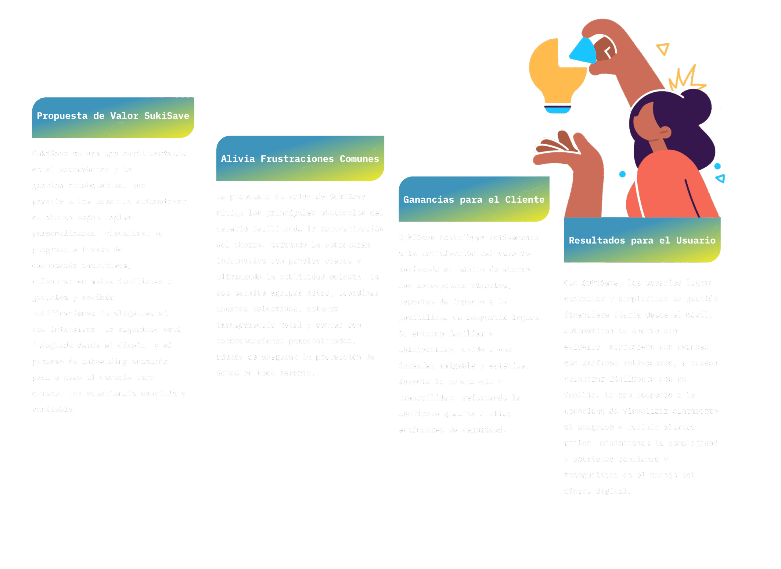 La propuesta de valor de SukiSavw surge de analizar las necesidades y deseos de los Usuarios, creando una solución que reúne servicios clave, resuelve sus problemas y aporta beneficios únicos a la comunidad.