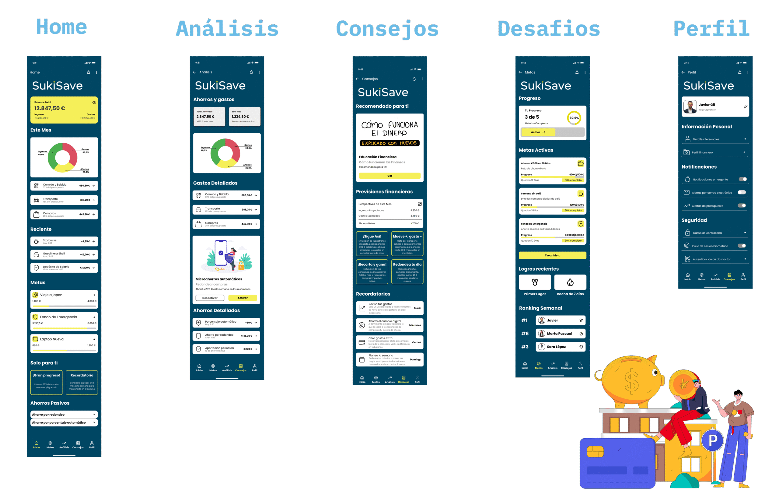 Finalmente, con SukiSave, mi proyecto final, pude integrar todo lo aprendido y aplicar de manera completa la metodología Design Thinking. Este proceso me permitió profundizar en la empatía hacia los usuarios jóvenes y nativos digitales, explorando cómo el diseño puede conectar con sus hábitos, motivaciones y lenguaje visual. La creación de una aplicación gamificada e interactiva me desafió a equilibrar la estética con la funcionalidad y a pensar en experiencias que no solo sean útiles, sino también atractivas y emocionales.